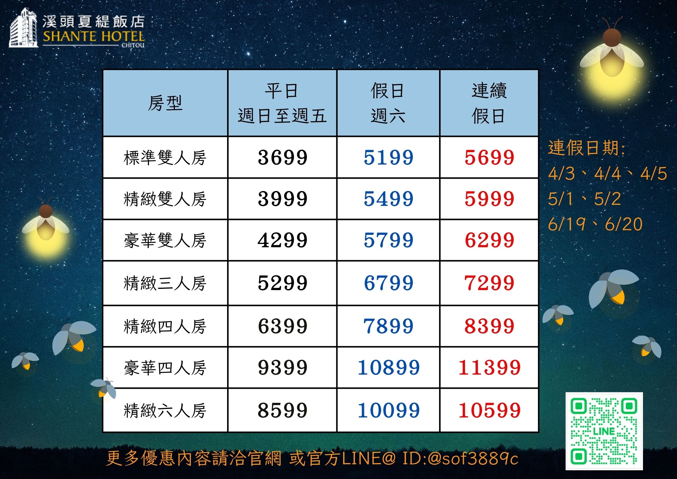 - 依房型人數贈送螢火蟲導覽(*加購螢火蟲導覽$50/人)